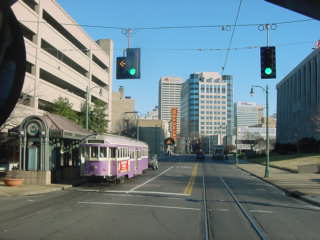 We ran on the edge of the bluff above the Mississippi River along the Canadian National main line by Vance Park then veered off the main line to travel through the curves to Central station. Our streetcar made its way down the hill into the neighbourhood before turning left and going under the main line and stopped in front of Central Station. Here we waited on our departure time so we would be in the proper position to go down Main Street. After ten minutes, we turned left onto Main Street and went north through downtown Memphis, passed the Transit Center, turned and stopped as our operator took a break.