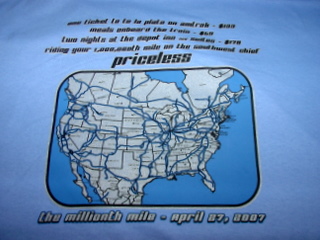 C.M. The back of the shirt. Tom Anderson designed the shirts, the Million Rail Mile hockey jersey and a Million Rail Mile sweatshirt, doing a fantastic job with all of them.