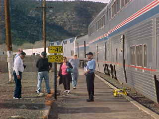 I met our conductor, who was very impressed that I was about to break the Million Rail Mile mark tomorrow. I checked my e-mail on Andy Smith's computer, who had been updating our progress on the Passenger Board of Trainorders.com and we departed thirty minutes late and I was taken to the transition car's crew lounge where I did a video interview for the documentary being made about my Million Mile Rail trip. The Southwest Chief next stopped in Lamy and I tossed the friendly Amtrak agent a T-shirt as she was so kind to me when I was stuck in Lamy for hours a few months ago. We finished this part of the interview and I went to the dining car to ride beyond Glorieta Pass then returned to my room for Jethro Tull's "Best of Acoustic" and some Sudoku puzzles.