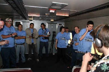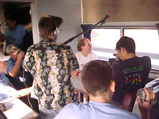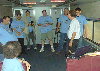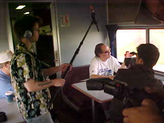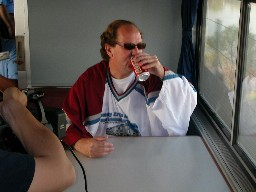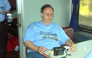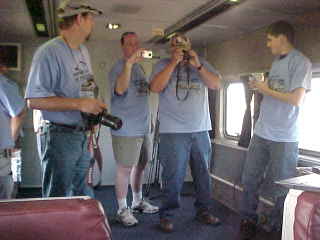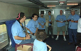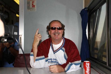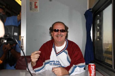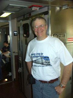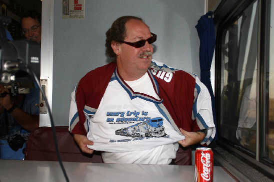 C.M. I met Rudy from Woodbury, Minnesota who had been wearing a Milwaukee Road 261 T-shirt and invited him to join the celebration and gave him one of the shirts we had to give away to people on the trip. I then just sat there for a minute and could not believe that I had reached one million rail miles, but was glad to have all these friends with me to celebrate this fantastic event of my life. Then, wearing my One Million Rail Mile hockey jersey, decided to walk through the whole train to the rear door. The video guys were in hot pursuit while Barbara, Steve's wife, was ahead passing out whistles to everyone on the train. Ken stopped me to congratulate me as did the rest of his dining car staff and it was all noisy as I made my way through the coaches. The best questions of the morning were by a girl's soccer team going to Burlington, Iowa for a soccer tournament.
