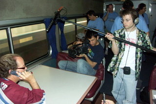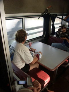 I returned through the train to my sleeper before visiting Carl and Andy. For my arrival into La Plata, I had to put my bags into the first sleeper so that I could go to the coaches to be the last one off. About ten minutes out, I walked back to the lower level of the second coach and sat on a step box. The Southwest Chief arrived at La Plata at 10:03 AM and did a double stop. First, all the luggage, passengers and cameras had to be off-loaded and ready for my arrival. Tom and Jonathan had come down and asked how many people were out there? I opened the door and I saw a mob!