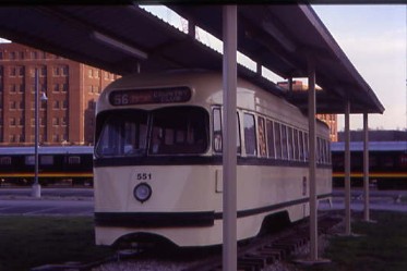 Kansas City Public Service PCC car 551, ex. Wester Railway Museum 1190 1979-2006, exx. San Francisco Municipal Railway 1190 1973-1979, exxx. Toronto Transit Commission 4752 1957-1973, nee Kansas City Public Service 551 1947 to 1957 built by St. Louis Car Company in 1947, on display to the north of the station.