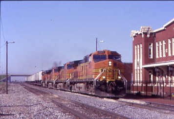 The Marceline Santa Fe station, built in 1913. We had a green eastbound signal and soon a headlight appeared out of the west.