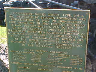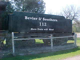 Bevier and Southern 2-6-0 112 built by Baldwin in 1920. The Bevier & Southern Railroad started life in 1914, when the Missouri & Louisiana Railroad divided, with the Missouri portion of railroad becoming the B&S. It hauled coal on a 9.18 mile line from Binkley, Missouri, to a connection with the Chicago, Burlington & Quincy Railroad at Bevier. The line was abandoned in 1982. 112 was donated to the City of Bevier, Missouri, in 1963 having travelled 364,562 miles in service.