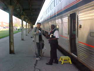 D.M. Dutch took a picture of me photographing the train. Everyone gathered their luggage and boarded. As I sat down in my coach seat, I thought "Where is Jonathan? I stuck me that we had not seen him at all this morning. The train started to move and I went looking for him, finding Chris Parker, who had realized that Jonathan was not with us at the station and sent Carl back to the Inn to get him. Carl returned just as the train was leaving and we departed La Plata. If Jonathan was going to make the rest of this trip, he would have to get up to Ottumwa, 80 miles north. Once I settled in, I went to the lounge car and found the rest of our group.