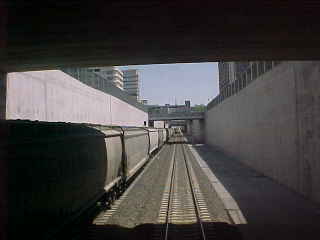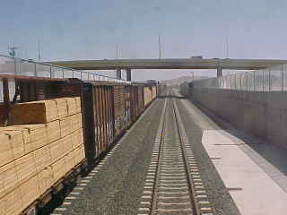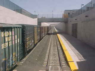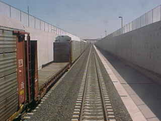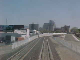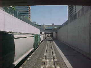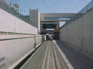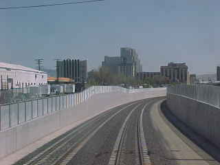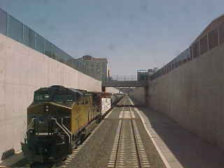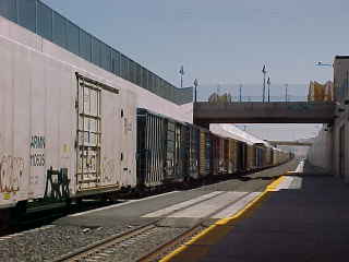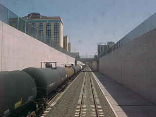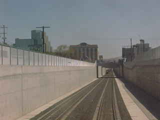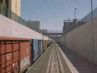 An eastbound freight was waiting for us to clear with its tail still in the trench as we started our descent into there. Reno is situated on a major rail corridor linking west coast ports, especially the Port of Oakland, to inland destinations. Prior to the Reno Transportation Rail Access Corridor (ReTRAC) project, dual mainline, at-grade rail tracks passed directly through the City's downtown, creating a number of concerns. By depressing a 2.25-mile downtown stretch of the rail corridor into a 1.75-mile-long, 54-foot-wide by 33-foot-deep trench, the ReTRAC project resolved numerous environmental, public health, and safety issues. An adjacent access road, relocation of the City's Amtrak station, and utility relocation was also included in the project.