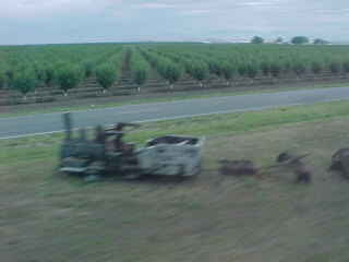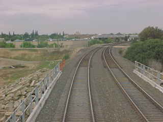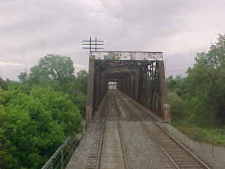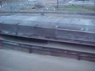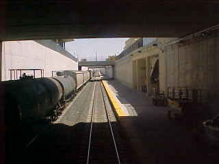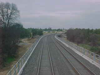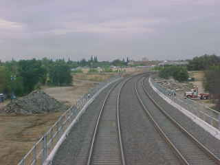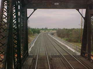 Coming off the American River bridge. One word describes this new trestle: Impressive! We arrived at Sacramento at 5:00 PM {2:15 PM}.