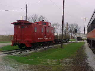 Illinois Central caboose 9831 built by Illinois Central at their Centralia Shops in 1941; this caboose was used in high-speed freight and local service throughout the railway's system.
