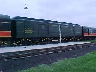 Illinois Central Railway Post Office and mail storage car 404 built by Pullman in 1918. This car was used to sort and deliver mail via train and is on display for visitors to explore. It was rebuilt in 1947 at the Illinois Central Burnside Shops.