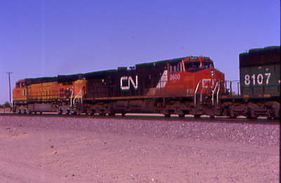 BNSF 5024 East came through Hector and we drove back to National Trails Highway and started east when we spotted another westbound BNSF with a Canadian National locomotive in its consist, so chased it west on Interstate 40 to the first Newberry Springs exit and went north back to the tracks.