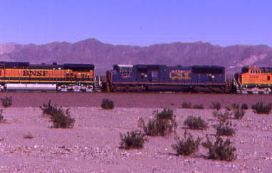 BNSF 7702 East with CSX 2725 and DPU's on the rear. We continued west, taking US 95 north to the road to Goffs where we turned left.