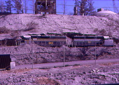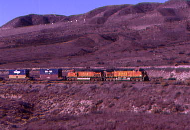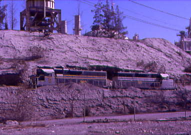 At the cement plant at Oro Grande, a large surprise. On the left is Bangor and Aroostook GP38 362, ex. Bangor and Aroostook 91, exx. Conrail 7663, exxx. Penn Central 7663, nee Pennsylvania Reading Seashore Line 2003 built by Electro-Motive Division in 1967. On the right is Bangor and Aroostook GP38 360, nee Bangor and Aroostook 88, built by Electro-Motive Division in 1967.
