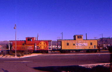 Santa Fe caboose 999728 built by International Car in 1978 and Union Pacific caboose 25599, built by International Car in 1964.