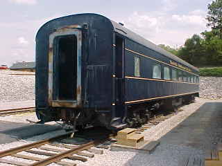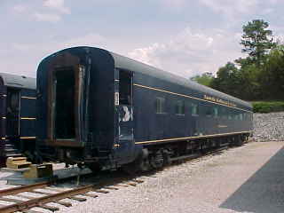 Tennessee Valley Railroad Museum first class car 98 "Eden Isle", ex. Intermountain Chapter National Railway Historical Society "Maggie II" 1962, exx. Baltimore and Ohio 98, nee Pullman 99, built by the company in 1917 as a private car for the president of the Baltimore and Ohio Railroad, Daniel W. Willard. Willard's lucky number was 99, therefore he desired to have his office cars carry the number 99. This luxurious car was equipped with a kitchen, quarters for the crew, a dining room, three elegant staterooms and a lounge. It was adorned with mahogany panelling, brass fixtures, interior windows of leaded glass and an observation platform. In 1918, the car was renumbered 98 and eventually re-assigned to a B&O Vice President, out of Baltimore; and by the 1940's the General Manger, F.G. Hoskins.