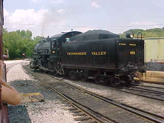 TVRM 610 on its way to the front of our train to pull us from East Chattanooga to Grand Junction. The consist of our excursion train was TVRM 2-8-0 610, open window coach 1000 and coaches 907 and 906.