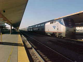I took a fresh air break, before putting "The Illusionist" on my DigEplayer. We departed at 8:23 AM after our engines were refuelled. During the movie, we stopped at Davis and Martinez then were stopped by track work at Crockett and had to wait until the eastbound California Zephyr passed before we continued to Emeryville, while I watched "The Gridiron Gang". We continued south to Oakland Jack London Square before making our way to San Jose via Niles. I detrained for some fresh air at San Jose and put on "Employee of the Month" before we departed at 12:08 PM {10:37 AM}.