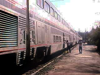 Here is Milt Bevins from San Dimas, making his first long-distance train ride to San Francisco. Next, a Metrolink train bound for Moorpark went by then finally at 2:08 PM, Pacific Surfliner 769 pulled beside our train with replacement F59PHI 457 on the point which was added to the point of the Coast Starlight. That Metrolink train from Moorpark then passed by on its return to Los Angeles.