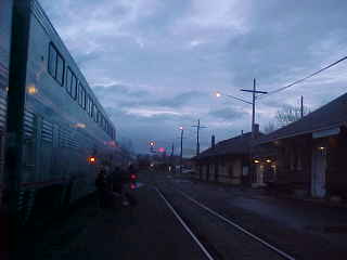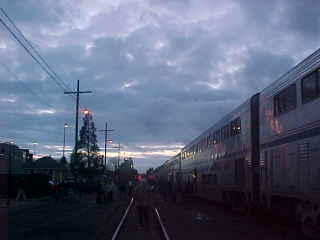 2/18/2007 Ron awakened everyone twenty minutes from Portland and it was announced that passengers going further north would be bussed and the Coast Starlight would terminate in Portland. Someone then placed their car on the tracks at MP 769.78, ten minutes away from Portland Union Station. We sat for 52 minutes while the police and a tow truck were called to remove the vehicle. At 3:13 AM, the Coast Starlight started moving again for the last few miles into Portland Union Station, arriving at 3:28 AM {3:40 PM}.