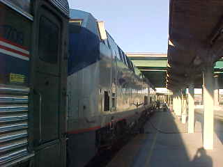 Coast Starlight 14 2/16/2007This train reversed in with P42DCs 121 and 118, baggage 1709, transition 39005, sleepers 32079 "Georgia" and 32071 "Arizona", Pacific Parlour Car 39972, diner 38005, lounge 33004, and coaches 34072, 34101 and 34045. I boarded the "Georgia" and had Room 7 with the wonderful Ron Harris as my sleeping car attendant. After storing my luggage in the room, I walked over to Track 11 to get pictures of our train.