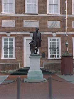 Independence Hall from the park in front of the Liberty Center. Construction started in 1732, the same year that George Washington was born. Built to be the Pennsylvania State House, the building originally housed all three branches of Pennsylvania's colonial government. The Pennsylvania legislature loaned their Assembly Room out for the meetings of the Second Continental Congress and later, the Constitutional Convention. Here, George Washington was appointed Commander in Chief of the Continental Army in 1775, the Articles of Confederation were adopted in 1781, and Benjamin Franklin gazed upon the "Rising Sun" chair in 1787.