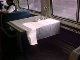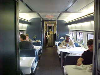 Once we had a green signal, we left town and I listened to Jethro Tull's "Back in Birmingham" as the day turned darker. The train took the siding at Crozel, Virginia while we waited for Amtrak 50, the eastbound Cardinal, which passed us at 3:24 PM. While I was finishing a Sudoku puzzle, I made a 5:00 PM dinner reservation then as the train passed through the first long tunnel, I switched to music from the "Two River Collection", the melodrama about Billy Miner that I saw on my Rocky Mountaineer trip over the Canadian Pacific Railway's mainline from Vancouver to Calgary and back. After Staunton, I switched to John Cougar Mellencamp's "Scarecrow" and it was then time for my first official Diner-Lite dinner.
