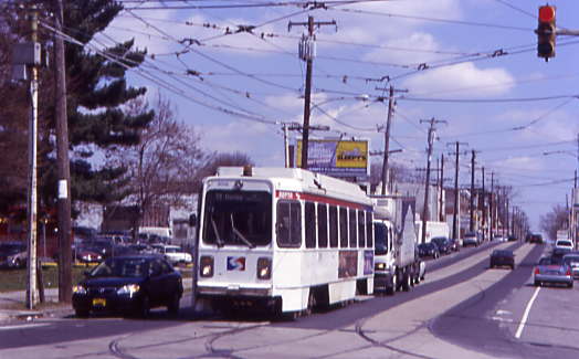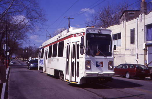 Westbound PCC 2330, built by St. Louis Car Company in 1947, arrived and I boarded. We headed west down Girard Street, stopping about every two blocks. As we came to the SEPTA line, trains passed overhead going both ways. At Broad Street, we picked up passengers from the subway.