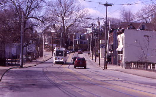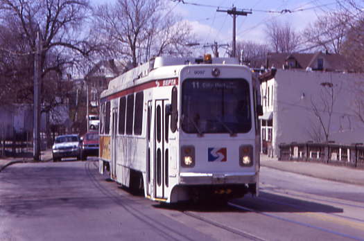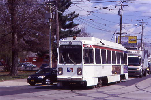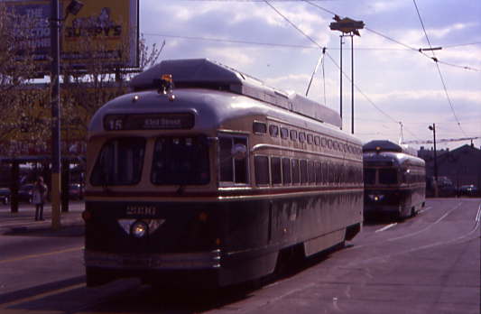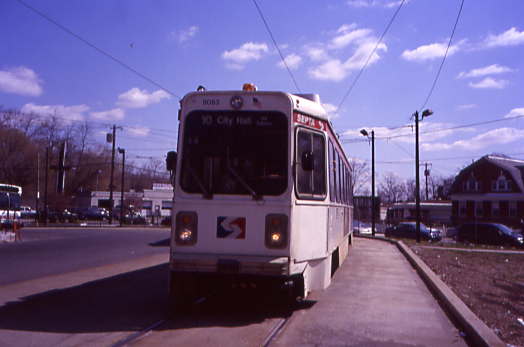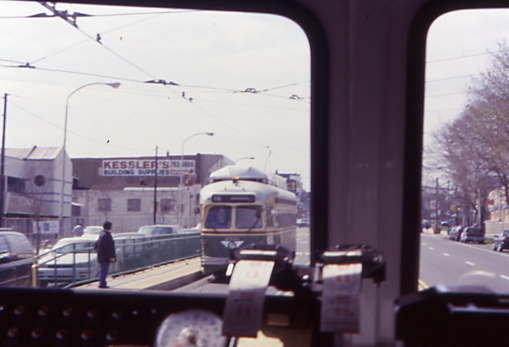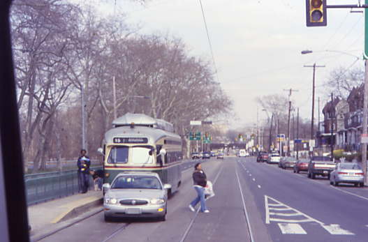 Our PCC car passed Girard College then turned north onto 25th Street for one block before returning to Girard Avenue. Continuing west, we passed the Philadelphia Zoo, crossed the Schuykill River and went under the Northeast Corridor where I saw Zoo Tower. A few minutes later, we crossed over Amtrak's Harrisburg Line and continued west to Lancaster Avenue, onto which we turned north for one block. We continued onto Girard Avenue, passing the Cathedral Cemetery, to 61st Street, then turned onto Robinson then south onto 63rd Street. We returned to Girard Avenue again and stopped behind another PCC awaiting its departure time.