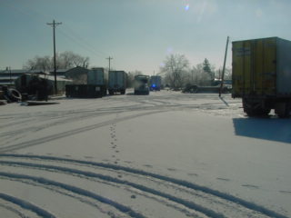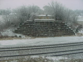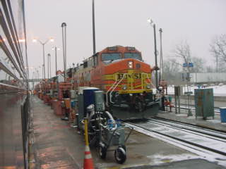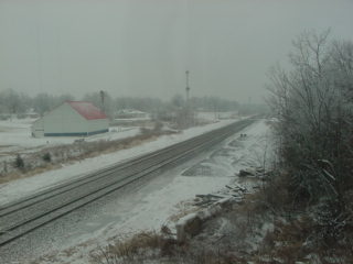 12/15/2007 We lost time while I slept due to a broken rail that had to be replaced before we could proceed. I awoke at Topeka and visited the lounge car for a cinnamon roll and watched the scenery from a table while we stopped at Lawrence, Kansas before making our way to Holiday and the BNSF mainline, then stopped at the Argentine fuel pads to refuel the engines.