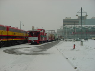 A BNSF train was also refuelling. After that, we arrived at a very cold Kansas City, where I detrained for pictures of the Kansas City Southern Holiday Train on display here for the next two days. I walked very carefully into the station, then made my way out to the north parking lot where the train was located.