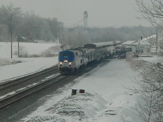 I saw the New Mexico Rail Runner before returning to the train for more "Kissology". We departed on time then at 1:00 PM, I went to the dining car for lunch and had the Chef's Luncheon Special, which today was Roast Beef and Mashed Potatoes. Any appetizers on this new menu one must buy, even if you are in a sleeping car. I was back in my room by a white Lamy before passing through Apache Canyon in a light snow, which continued to the top of Glorieta Pass and at Fox, we passed the westbound Southwest Chief in the siding. I continued to enjoy "Kissology" as we crossed the Pecos River and rounded the "S" curves before reaching Las Vegas.
