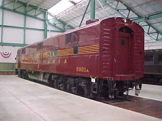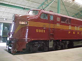Pennsylvania Railroad E7A 5901 built by Electro-Motive Division in 1945. Due to be scrapped shortly after retirement, quick thinking on the part of railroad employees saved the locomotive, hiding it for a time in an abandoned section of the Harrisburg roundhouse. The Pennsylvania Historical and Museum Commission raised the $20,000 scrap value to purchase it in 1976. The 5901 and sister engine 5900 were the first diesel-electric passenger locomotives built for and delivered to the Pennsylvania Railroad.