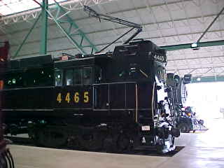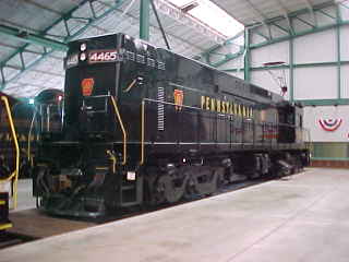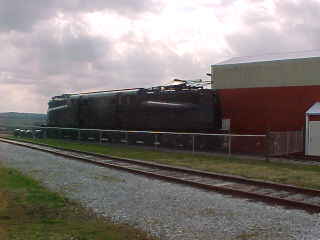 Pennsylvania Railroad E44 4465 built by General Electric in 1963. Referring to its pair of three-axle trucks and boxy carbody, train crews often called the E44's "bricks". The unit served the PRR in freight service for five years before becoming part of Penn Central and finally Conrail. Amtrak considered using the big electric for maintenance-of-way service on the Northeast Corridor until newer federal regulations addressing the use and disposal of polychlorinated biphenyl (PCBs), a toxic chemical used to cool the transformer, made its operation cost prohibitive. This sole unit was officially turned over to the Railroad Museum of Pennsylvania on April 27, 1991 and was the last electric locomotive built for the Pennsylvania Railroad.