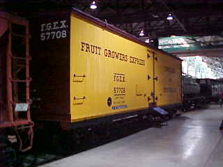 Fruit Growers Express refrigerator car 57708 built by Fruit Growers Express in 1924. Before the advent of the refrigerated car, Americans were limited to foods that could be grown locally. This new transportation technology not only kept produce fresh but also revolutionized the meat-packing and brewing industries by centralizing production. Before mechanical refrigeration, ice was the key. Workers loaded blocks of ice through roof-top hatches. As the ice melted, the water drained through chutes in the corners. Insulated walls, three inches thick, and a built-in circulating system driven by the car's wheels cycled the cool air from floor to ceiling.