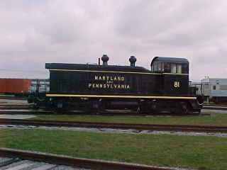 Maryland and Pennsylvania Railroad NW2 81 built by Electro-Motive Division in 1941. Maryland & Pennsylvania for the most part was a very active short line that operated between York, Pennsylvania and Baltimore, Maryland. MPA ended up being more progressive than most of the larger railroads with their adoption of three new diesels in 1946, 81 being among them. It worked switching duties in the yard and branchline for MPA faitfully until it was leased and sold to PH Glatfelter Paper Company in the 1980's where it was used at their Spring Grove plant. Glatfelter donated the locomotive to the Railroad Museum in 1997.