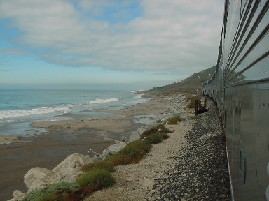 Where the Pacific Surfliner meets the surf north of Ventura. It was a beautiful run along the coast this morning and we did not get stopped at Seacliff. At Carpinteria, the Boy Scouts detrained and a few minutes later, our train delivered us to the station at Santa Barbara.