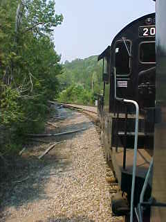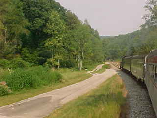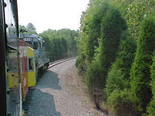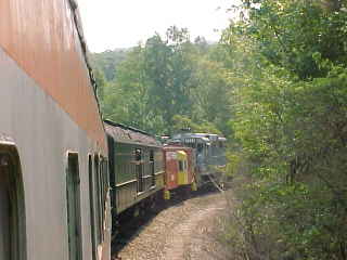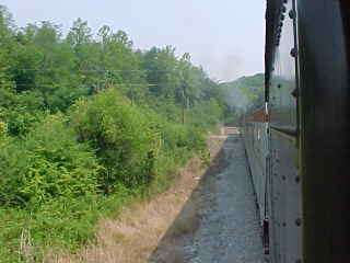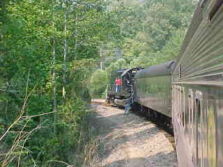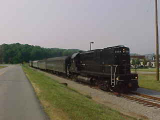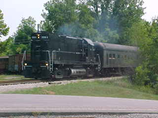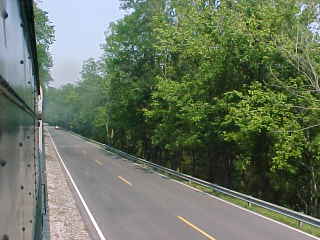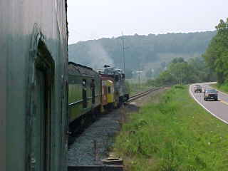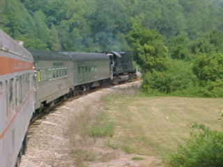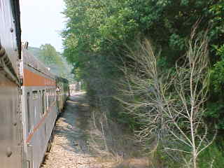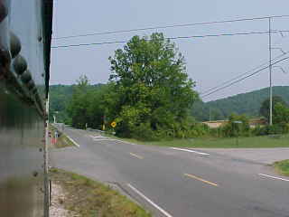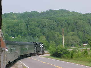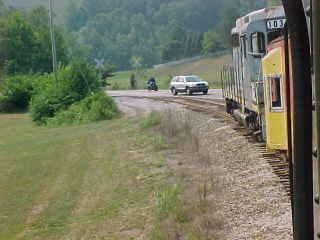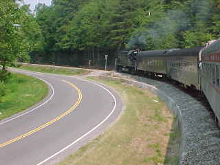 Another view of our train. Chris then told me that he had lost his glasses but was not sure where so John and I offered him our services and drove out along the line past Poplar Creek and started to walk the tracks. All three of us must have walked over five miles of track, but we had no luck in finding them. Chris then decided it was time to give up and a big well-hearted thank you to us for trying, after which he found a Lenscrafters at a mall in Knoxville. We decided to photograph the 3:00 departure before we left. After showing a pair of ladies to the train, we went back to the road crossing by Poplar Creek.