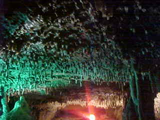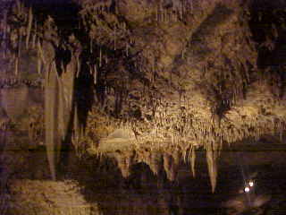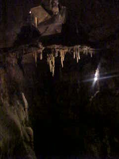 Fairyland, the most active part of Seneca Caverns. The stalactites you see are called soda straw stalactites and are made when water drips over them so fast that the centers do not have time to harden.