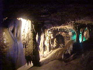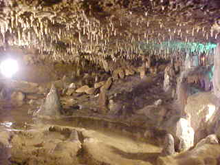 The Grand Ballroom, second largest room in the Caverns. It is 30 feet wide, 60 feet long and 70 feet high. Legend says that Princess Snowbird was married here in this room and today, weddings are still conducted here.