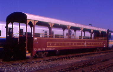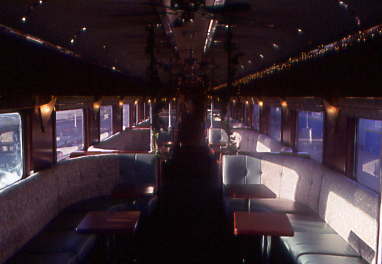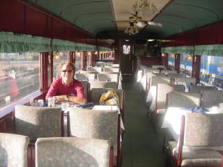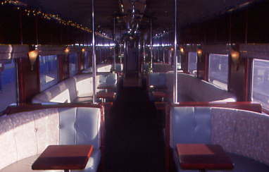 The train side view of the new boarding area. The Golden Sunset Dinner train consisted of Sierra Railroad GP20 50, power car, SERA 7005 El Capitan, SERA lounge car 7007, table car "Yosemite Falls", SERA 7000 "Yosemite Valley" and California Western open car 692 "Quiburi Mission". We were seated in the Yosemite Valley, the home-built table car from a former Long Island commuter car. Only the circular window in the doors give away this beautiful wooden interior car's origins. It used to carry hundreds of commuter to and from work and now only happy dinner train passengers.