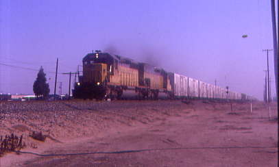 The scene on Highway 99 when we finally managed to get off at Manning Road. We detoured west to Cedar Avenue and took that back to California Highway 99, travelling through Fresno and Madera. North of there, we caught up to a northbound Union Pacific freight train and north of Chowchilla, we exited the freeway to set up for a picture.