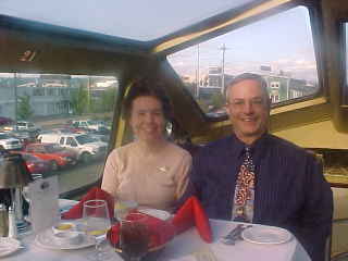 I was really impressed with the climb up Tacoma Hill. I returned to the dome and as we made our way to Frederickson, my Prime Rib, as well as Bob and Elizabeth's salmon, were served. All meals were very delicious and good railroading conversations were had as we enjoyed our meals aboard the Spirit of Washington Dinner Train. Everyone along our route was waving at our train and one sign read "Who needs a Winery!"