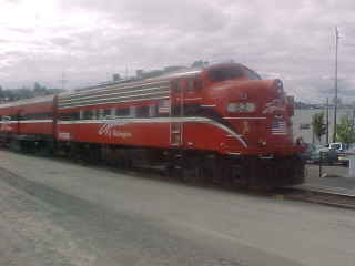 The Spirit of Washington was powered by F9 diesel electric engines built by General Motors in the 1950s -- one at each end. F9 number 84, painted red and with the Spirit of Washington logo on its nose, pulled several passenger cars and two domed cars; the latter offered better views for a premium price. Train cars bore iconic names: "Olympic", "Mt. Rainier", "Columbia Winery", "City of Renton", "Cascade", "City of Seattle", and "Chateau Ste. Michelle."