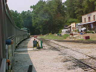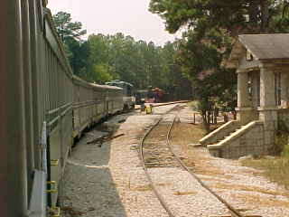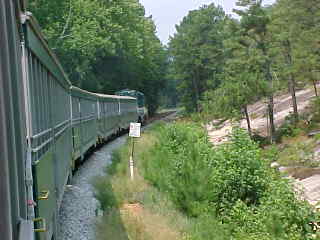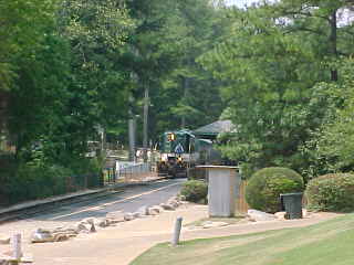 We arrived at the Confederate Hall station and picked up some hikers who had taken the Summit Skyride to the top of Stone Mountain, then hiked down here to board the train. We passed through the forest on our return to the Crossroads station, where our trip around Stone Mountain ended.