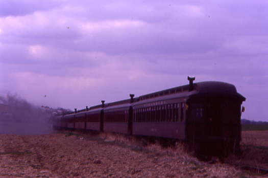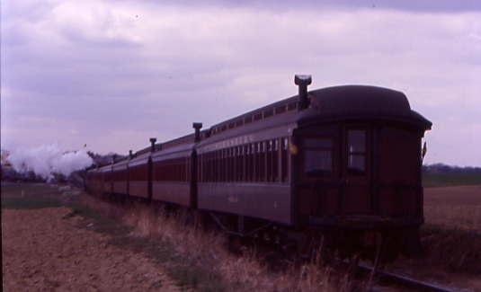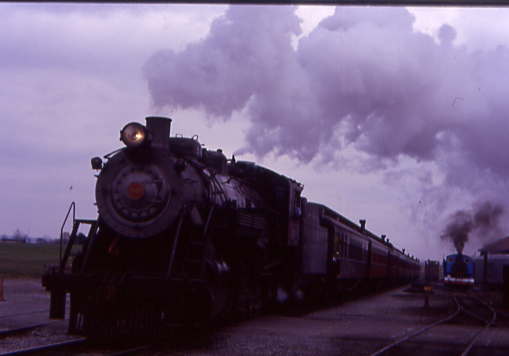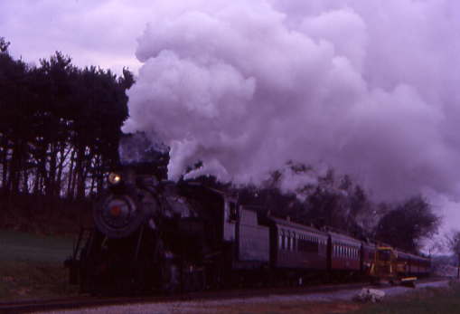 Great Western 90 would pull the train backwards to Paradise. Our train consisted of Great Western 2-10-0 90, coaches 62 "Gobbler's Knob" built in 1897, 72 "Mill Creek" built in 1906, 59 "Grasshopper Level" built in 1904, 65 "Walnut Hollow" built in 1910, 105 "Warren F. Benner", diner 93 "Lee E. Brenner" built in 1909, table/parlour 75 "Henry K. Long" and parlour 88 "Marion". The three of us boarded "Gobbler's Knob" and chose seats in the middle.