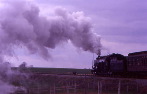 Thomas the Tank Engine returning from Paradise. I returned to Strasburg, stopping at the grade crossing at Cherry Hill Road and after picking up some passengers at Groffs, the train came foward, charging by my location.
