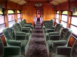 Interio of Strasburg Rail Road parlour-observation car 88 "Marian", ex. Strasburg Rail Road "Pequea Creek" 1971, nee Boston and Maine 1393 built by Laconia Car Company in 1910. The Strasburg Rail Road purchased the car in January 1971 and in 1988, transformed the car into the top-of-the-line luxury railcar. Its name of "Marian" is in honor of the Strasburg Rail Road Company’s first corporate secretary and the wife of William M. Moedinger, the third president of the tourist company. Marian Moedinger was one of the original 24 shareholders who helped revive the railroad in 1958 and save it from abandonment.