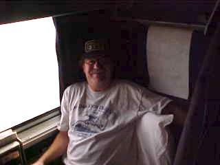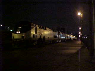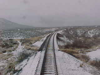 The Sunset Limited at rest at El Paso. I detrained to get a newspaper and a picture of the train and met Kevin and his dad. Kevin reads my website and it is always interesting to meet one of my readers. We departed on time and at 6:30 PM, after we entered New Mexico, I went to the dining car and was seated with Jackie from Huntington Beach, heading home from Fort Worth, and William who works in Big Bend National Park and has climbed 64 mountain peaks, going to Tucson. I enjoyed a pork chop and chocolate cake then had an after-dinner shower before enjoying an evening of music in my darkened room. Later, I made up my room for the night.