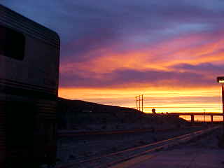 I awoke at 5:30 AM as the train was paralleling the Salton Sea in the dark. After getting dressed, I proceeded to the lounge car to wait for breakfast to be served then as we neared Thermal at 6:00 AM, I went into the dining car and discovered that there was no French toast nor Bob Evans breakfast aboard this train. I cannot eat eggs, so I had to settle for a modified continental breakfast of a bowl of Rice Krispies, sausage patties and a croissant. After breakfast, it was back to my car to be ready for the fresh air stop at Palm Springs.