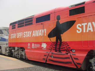 It features a surfer crossing the tracks, similar to the one that Pacific Surfliner 768 hit just short of San Clemente Pier. That surfer was lucky as he only had to go to the hospital, not the morgue.