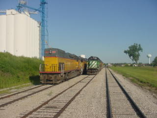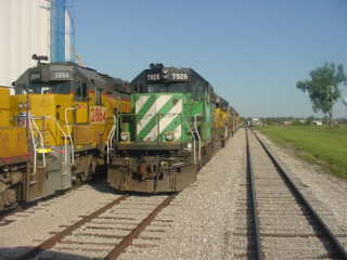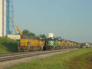 A mixture of Union Pacific, Burlington Northern and First Union Rail locomotives. Looking down the tracks I saw where our train was so drove over to it and parked.